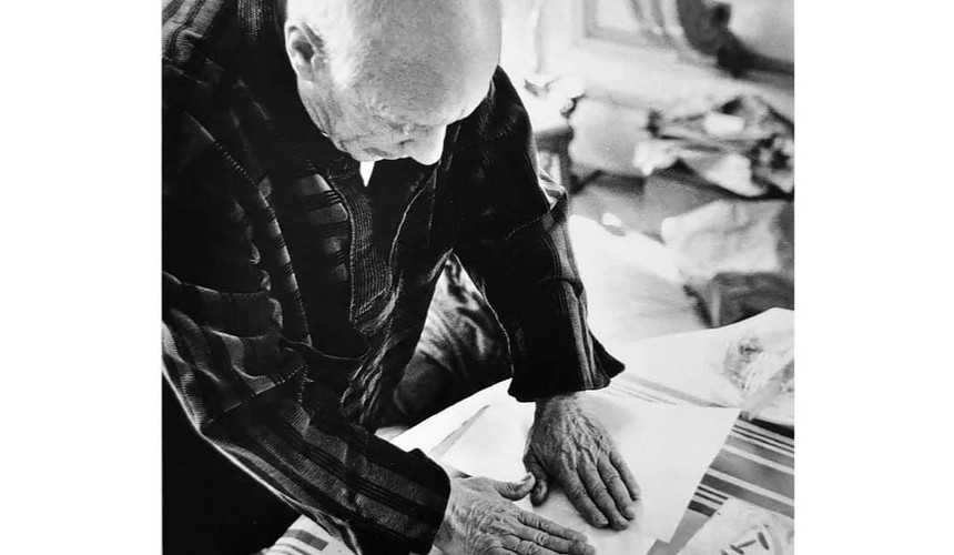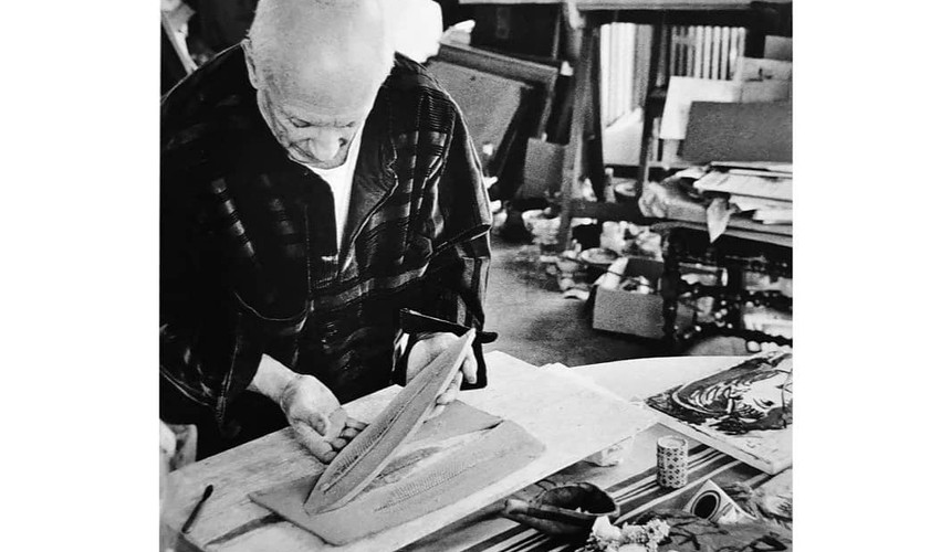 📸 Picasso produzindo a obra "Corrida de Toros y Pez", fotografado por David Douglas Duncan em 16 de abril de 1957, Cannes.